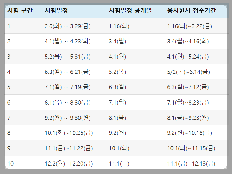 시험에 관한 자세한 일정과 응시 요령은 시험 공개일에 안내됩니다. 본인과 가까운 시험센터에서 2024년 시험 일정을 확인하고 응시할 수 있습니다.